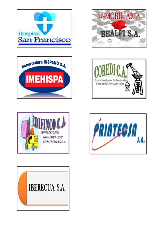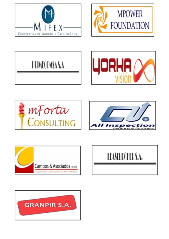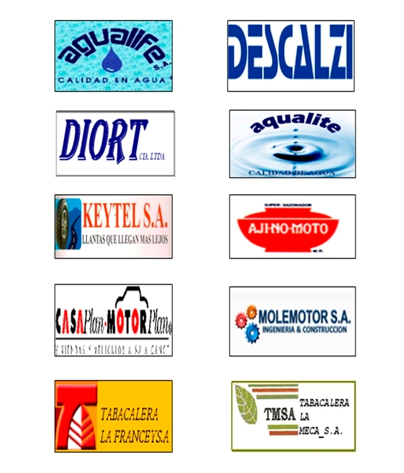 AGUALIFE S.A. DITECA S.A. CASA PLAN MOTORPLAN S.A. MOLERMOTOR DISTRIBUIDORA DESCALZI S.A. FASTLINE CIA. LTDA. INMOBILIARIA MARSELLA CIA. LTDA FEBRES CORDERO CIA. DE COMERCIO MOLINOS CHAMPION S.A. XOTERRENOS S.A. SERVICIO DE RENTAS INTERNAS GYEMFORTA S.A.MARHIELO CIA. LTDA. MIFEX – COOPERATVIVA DE AHORRO Y CREDITOHACEB DEL ECUADOR S.A.SAN MIGUEL INDUSTRIAL SAMEC S.A.GRAFICAS VISION S.A.AUTORIDAD PORTUARIA DE ESMERALDAS ENTRE OTRAS...